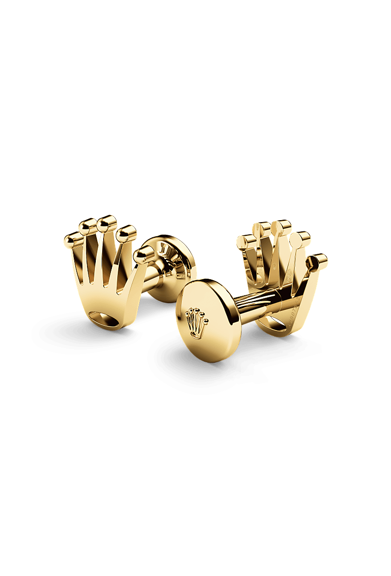 Rolex-manchetknopen van 18 kt geelgoud in de vorm van de kenmerkende Rolex-kroon.